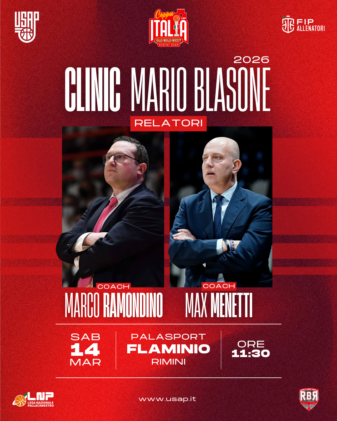 Sabato 14 marzo p.v. alle ore 11.30 a Rimini (PalaSport Flaminio), in occasione della Coppa Italia LNP 2026, si terrà il Clinic organizzato dall’U.S.A.P., in collaborazione con il C.N.A., la Lega Nazionale Pallacanestro e la Società RBR Basket Rimini, che quest’anno sarà dedicato alla memoria di Mario Blasone, uno dei più grandi maestri della pallacanestro italiana.