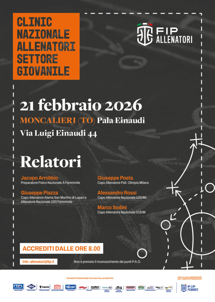 Il C.N.A., in collaborazione con il Comitato Regionale Piemonte, organizza il Clinic per Allenatori di Settore Giovanile per il nord che si svolgerà a Moncalieri (TO) presso il Pala Einaudi sito in Via Luigi Einaudi 44 il giorno 21 febbraio 2026.